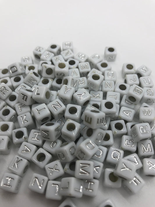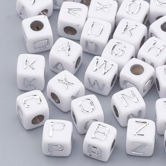 500 Acrylic Cube White & Silver At Random Initial Alphabet Letter Beads