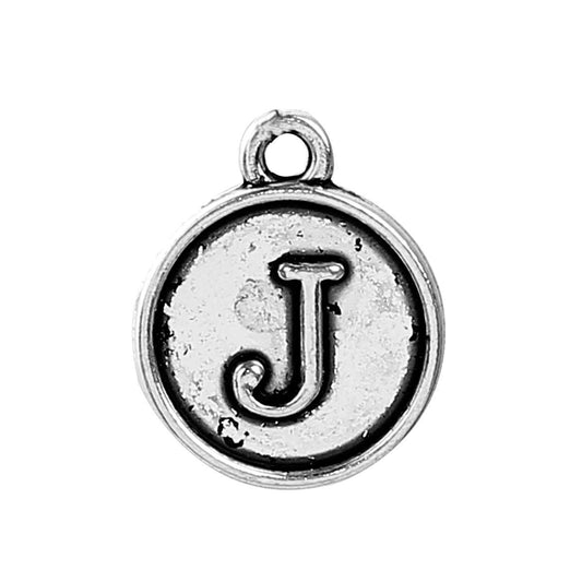 Letter J Charms Antique Silver Tone, Round Initial Charms
