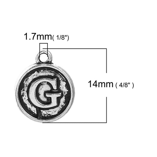 Letter G Charms Antique Silver Tone, Round Initial Charms