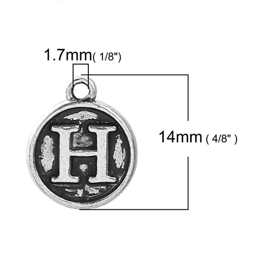 Letter H Charms Antique Silver Tone, Round Initial Charms