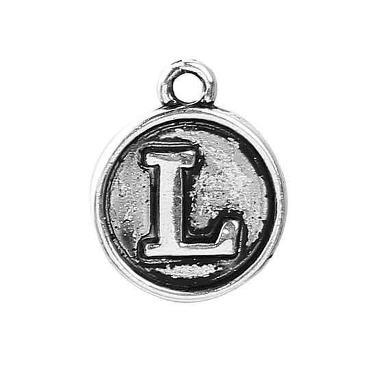 Letter L Charms Antique Silver Tone, Round Initial Charms