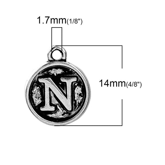 Letter N Charms Antique Silver Tone, Round Initial Charms
