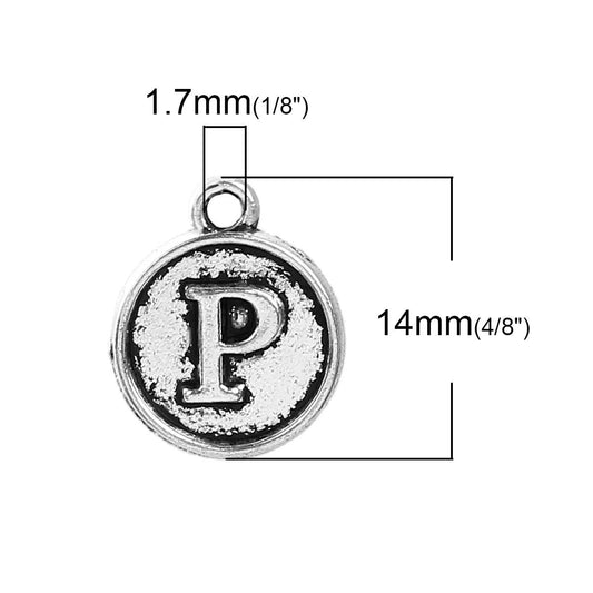Letter P Charms Antique Silver Tone, Round Initial Charms