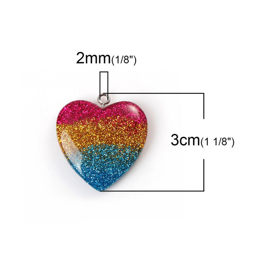 3 Rainbow glitter heart pendant, 30mm x 27mm